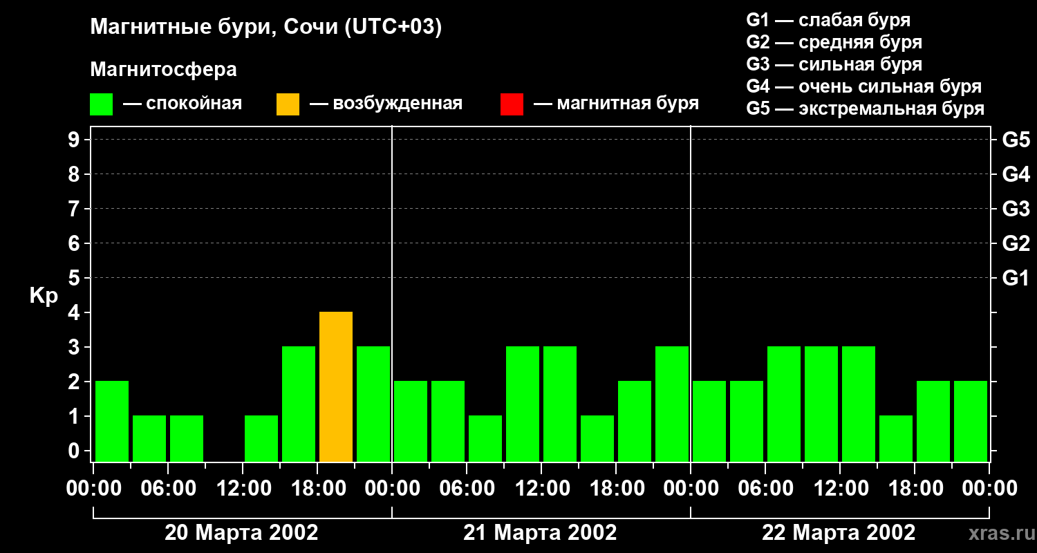 Изменения геомагнитного индекса Kp с 20 по 22 марта 2002 года для средних широт