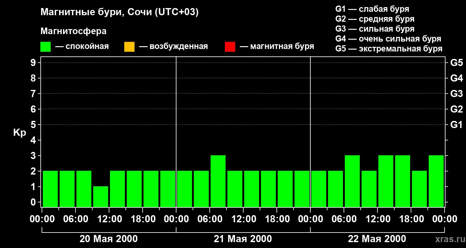Изменения геомагнитного индекса Kp с 20 по 22 мая 2000 года для средних широт