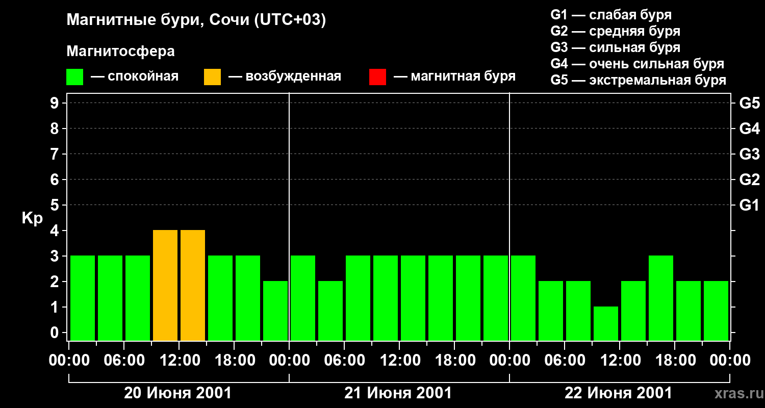 Изменения геомагнитного индекса Kp с 20 по 22 июня 2001 года для средних широт