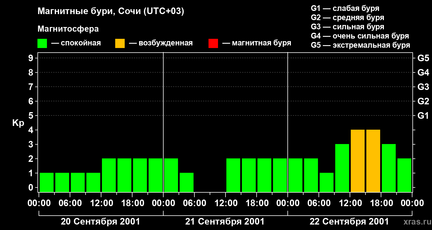 Изменения геомагнитного индекса Kp с 20 по 22 сентября 2001 года для средних широт