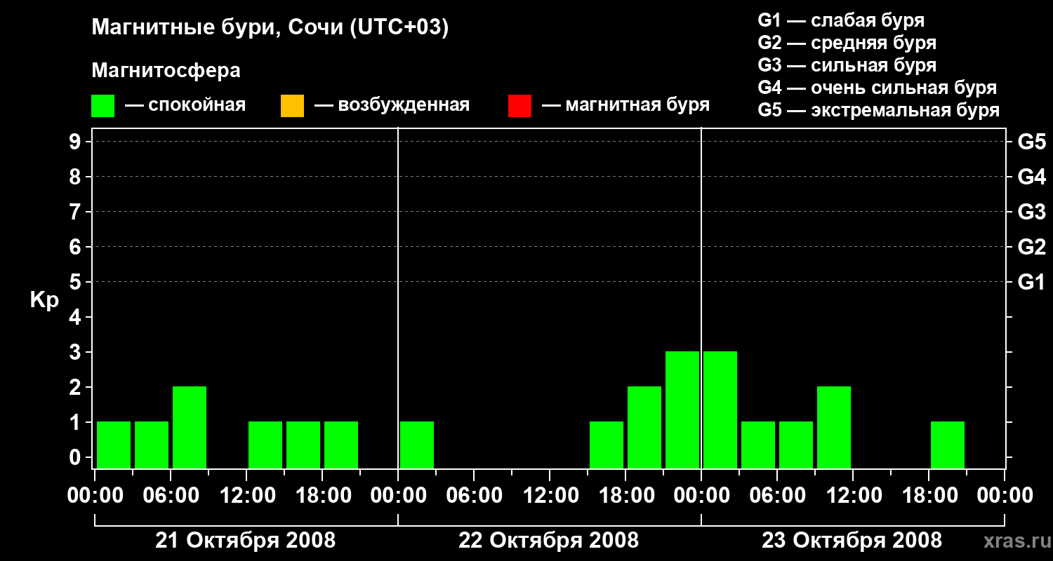 Изменения геомагнитного индекса Kp с 21 по 23 октября 2008 года для средних широт