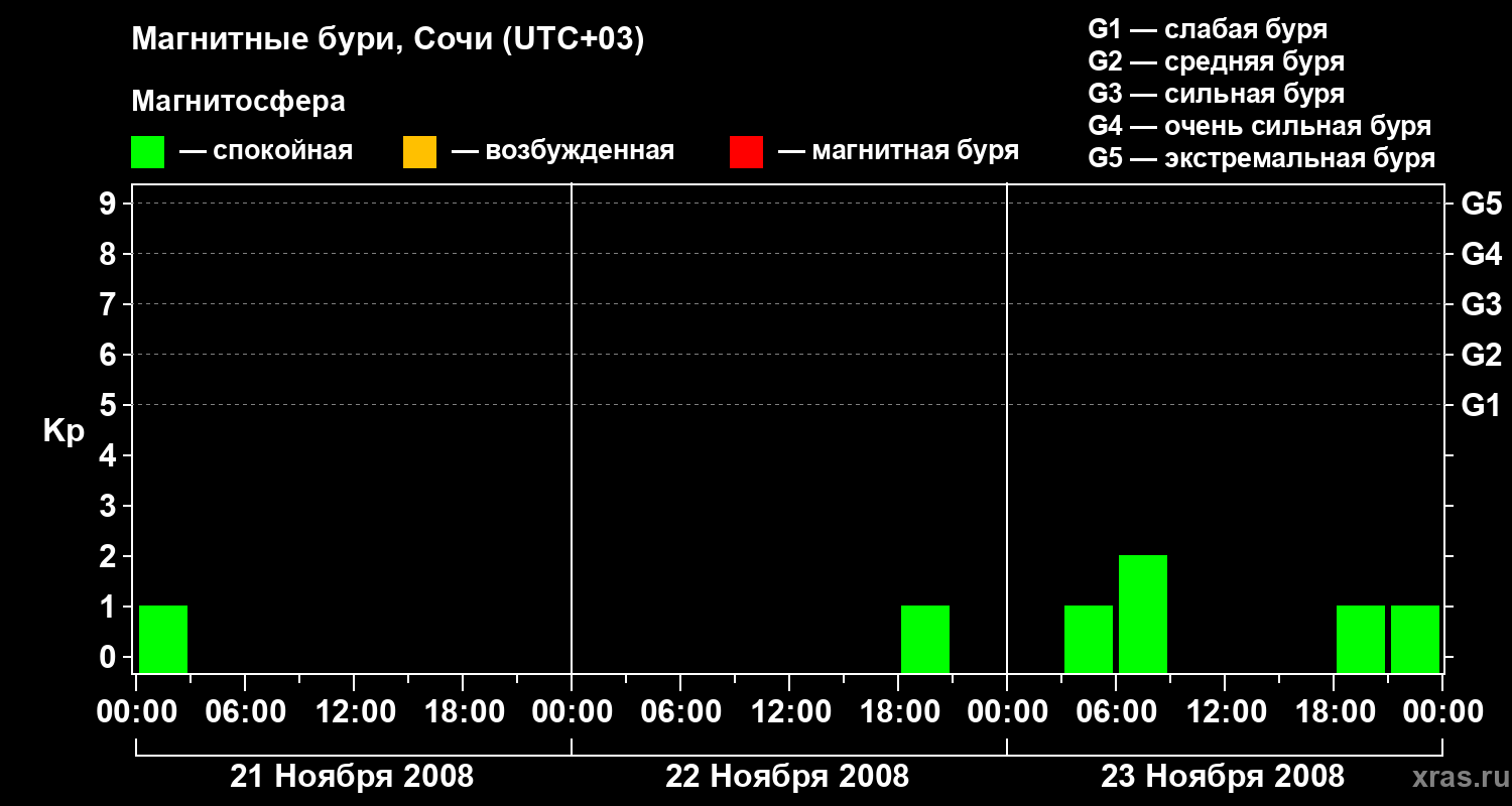 Изменения геомагнитного индекса Kp с 21 по 23 ноября 2008 года для средних широт