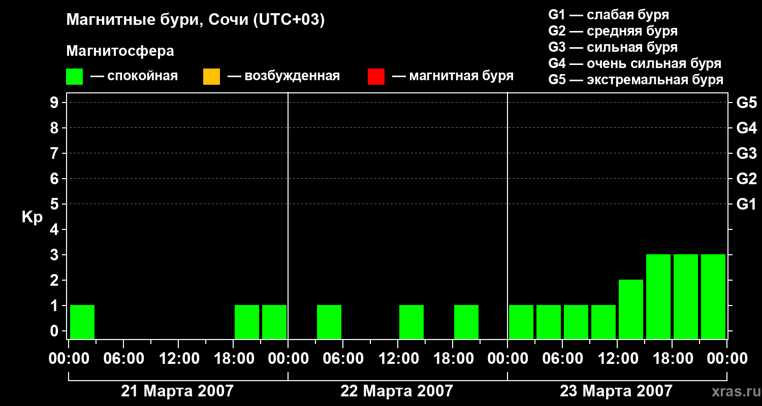 Изменения геомагнитного индекса Kp с 21 по 23 марта 2007 года для средних широт
