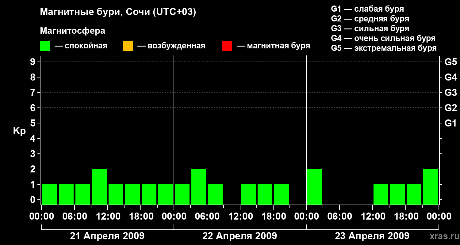 Изменения геомагнитного индекса Kp с 21 по 23 апреля 2009 года для средних широт