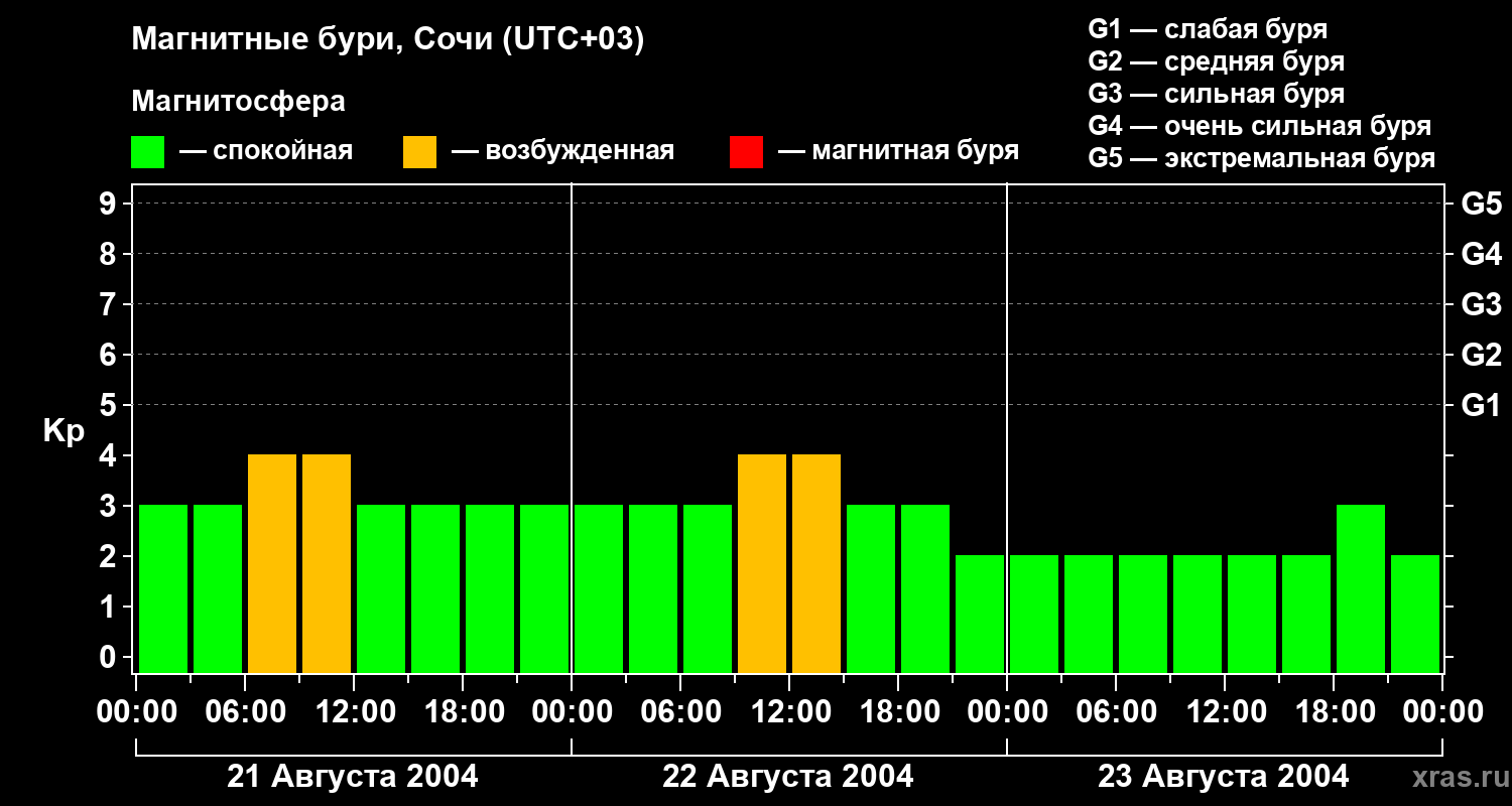 Изменения геомагнитного индекса Kp с 21 по 23 августа 2004 года для средних широт