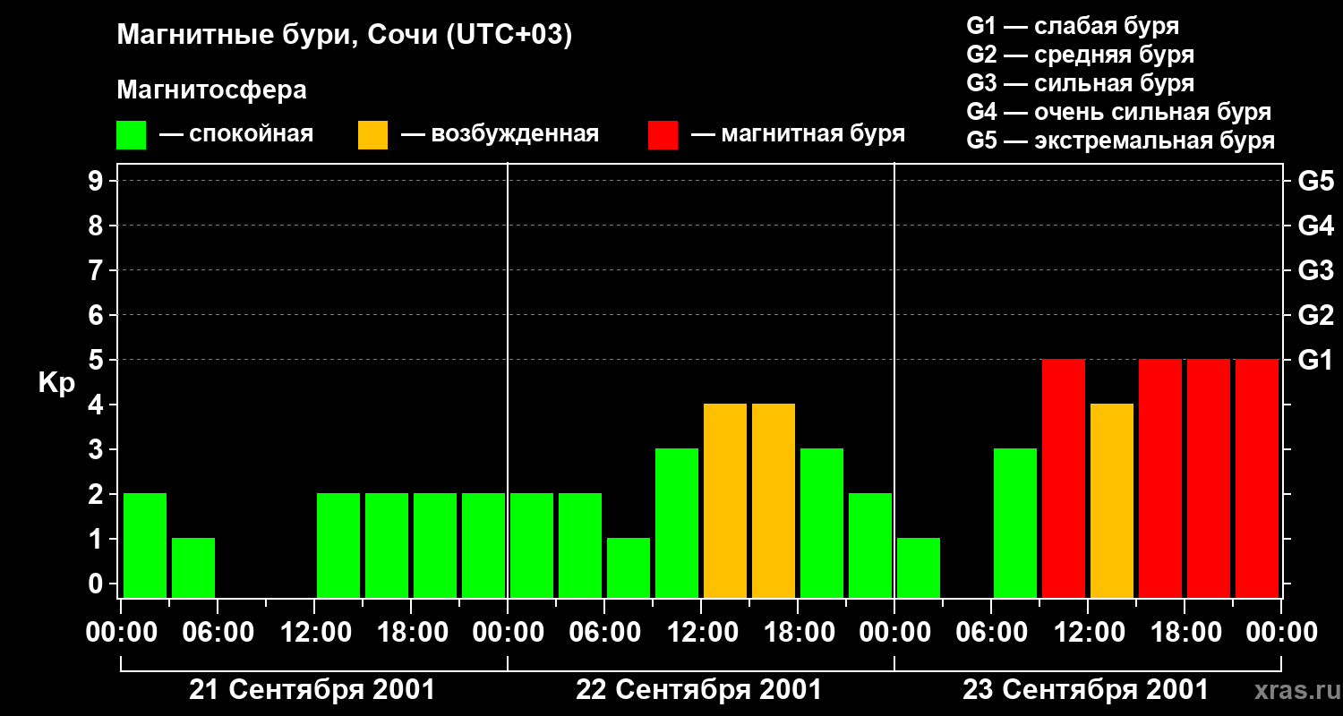 Изменения геомагнитного индекса Kp с 21 по 23 сентября 2001 года для средних широт
