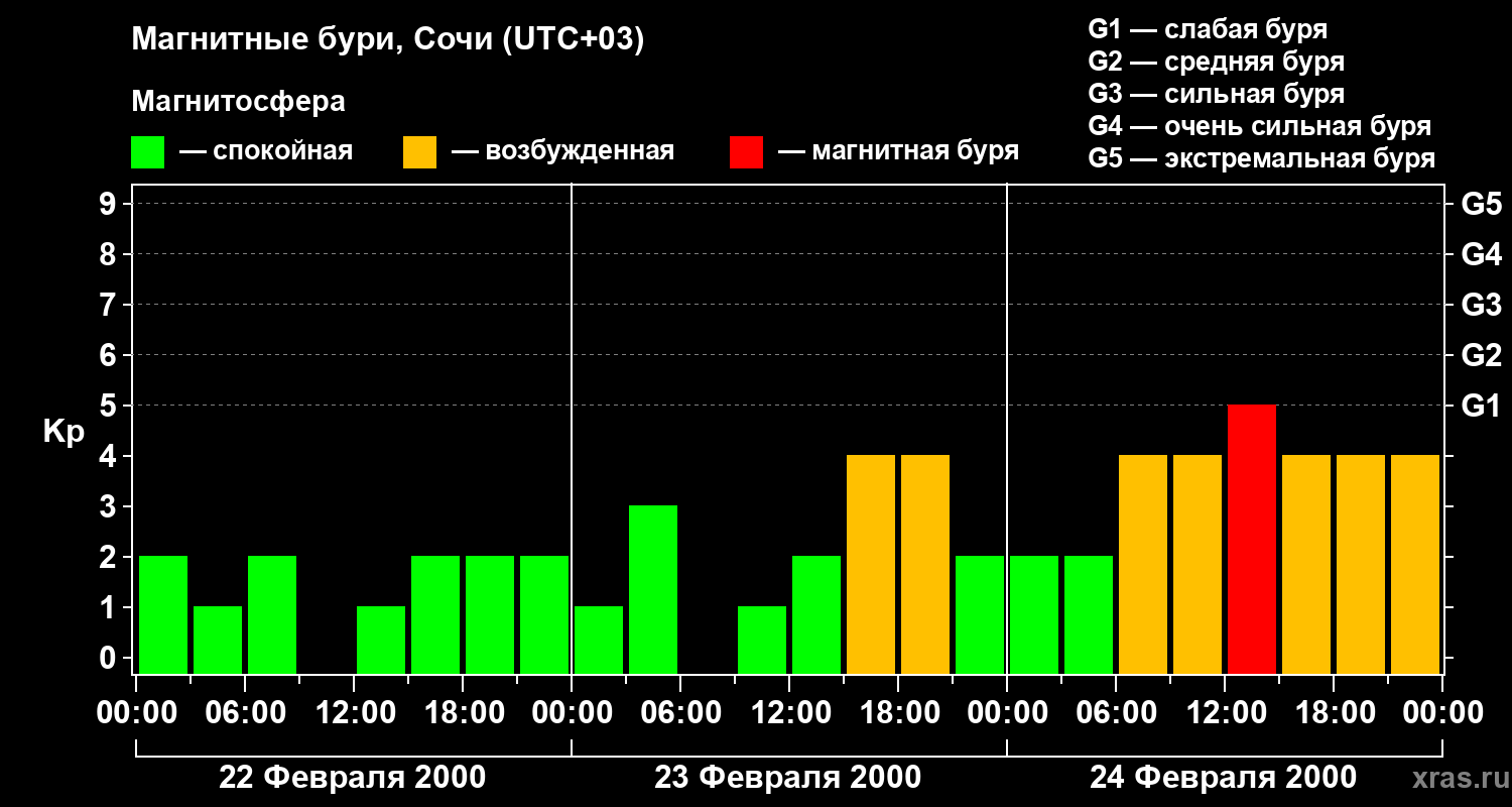 Изменения геомагнитного индекса Kp с 22 по 24 февраля 2000 года для средних широт