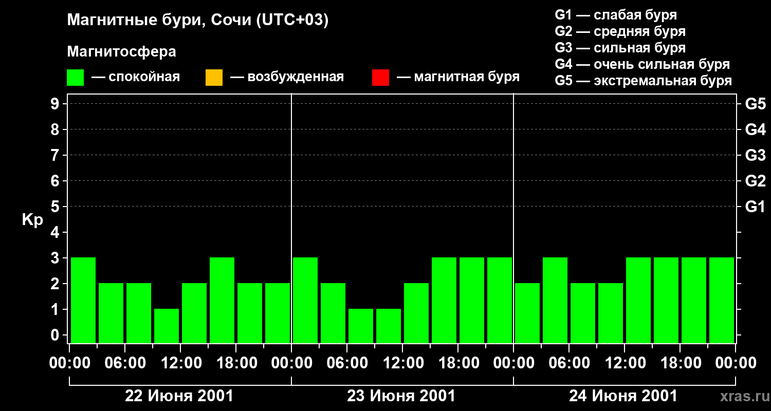 Изменения геомагнитного индекса Kp с 22 по 24 июня 2001 года для средних широт