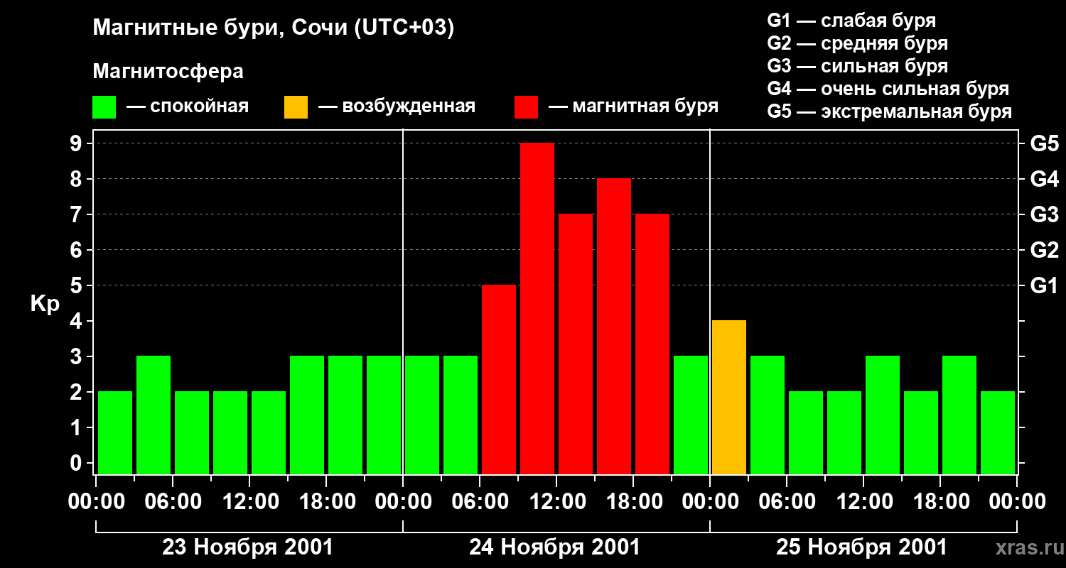 Изменения геомагнитного индекса Kp с 23 по 25 ноября 2001 года для средних широт