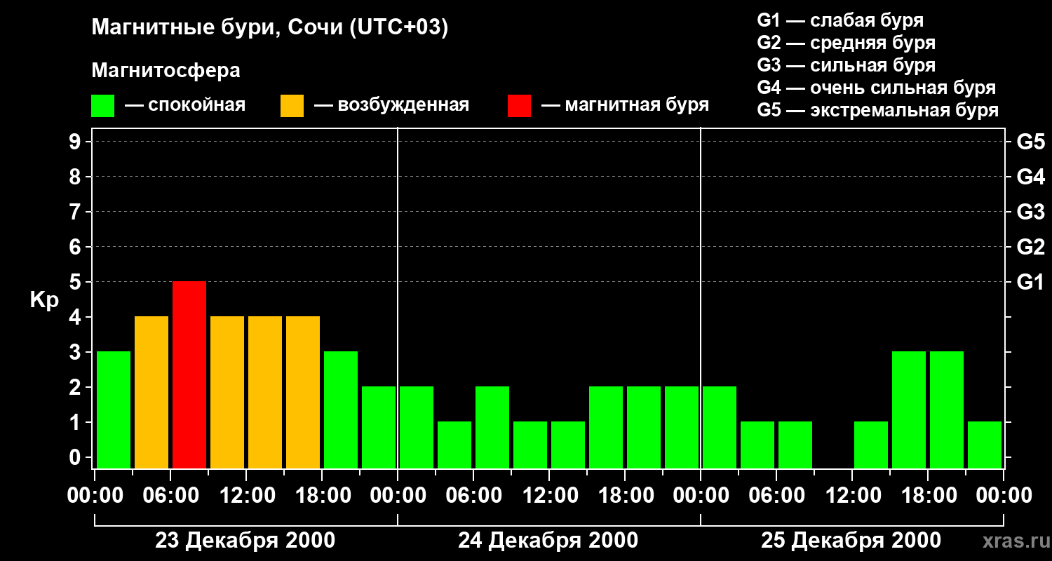 Изменения геомагнитного индекса Kp с 23 по 25 декабря 2000 года для средних широт
