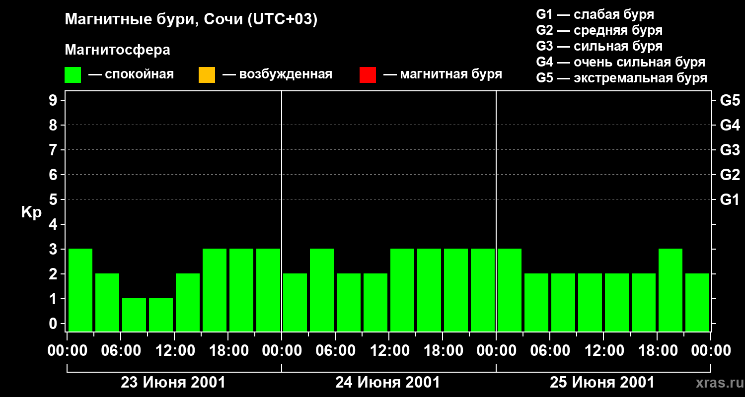 Изменения геомагнитного индекса Kp с 23 по 25 июня 2001 года для средних широт