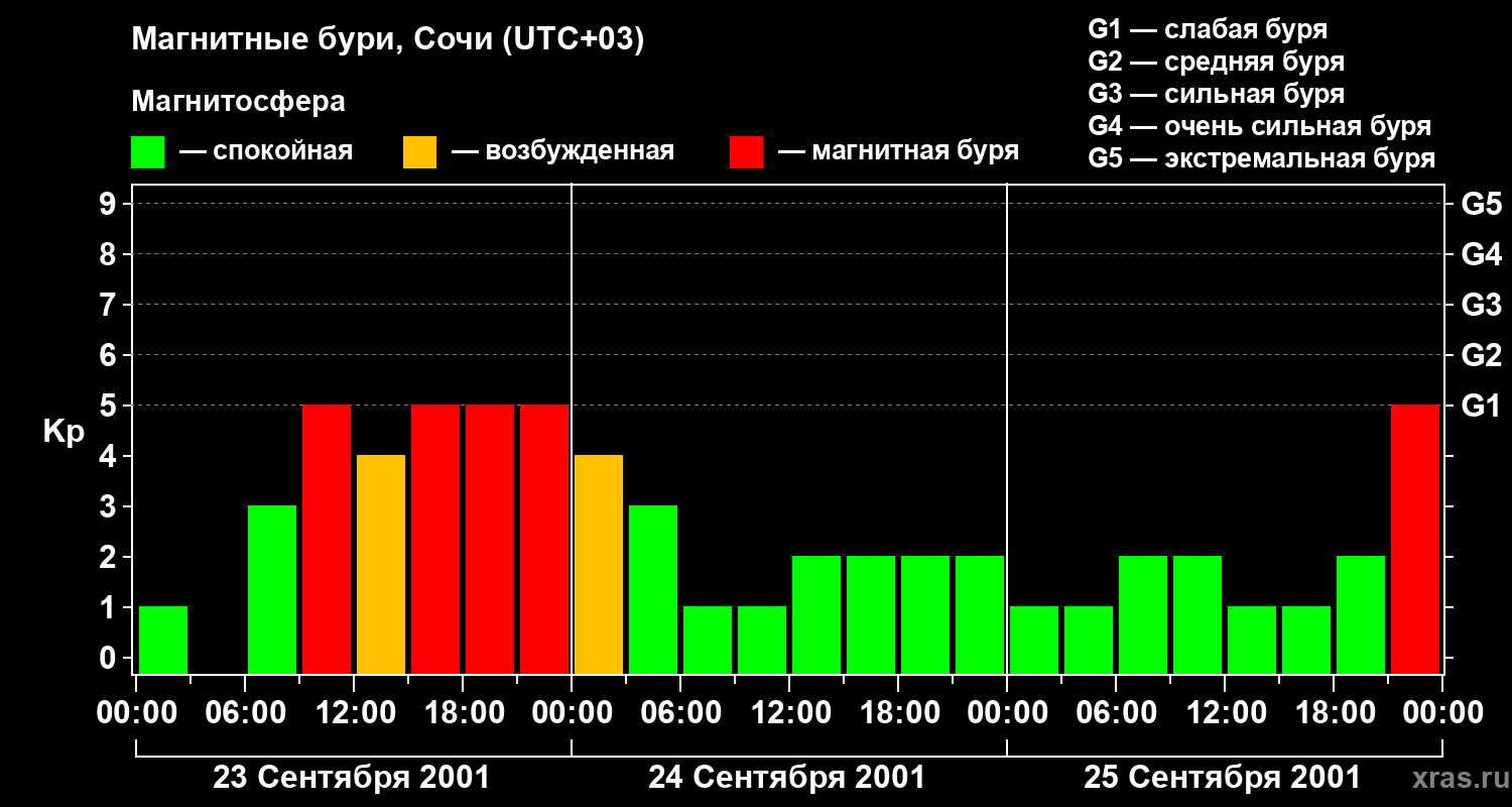 Изменения геомагнитного индекса Kp с 23 по 25 сентября 2001 года для средних широт