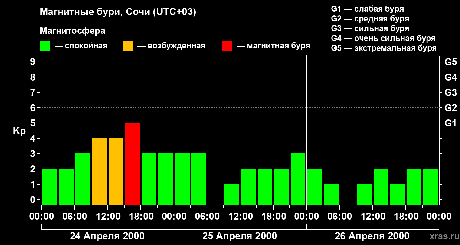 Изменения геомагнитного индекса Kp с 24 по 26 апреля 2000 года для средних широт
