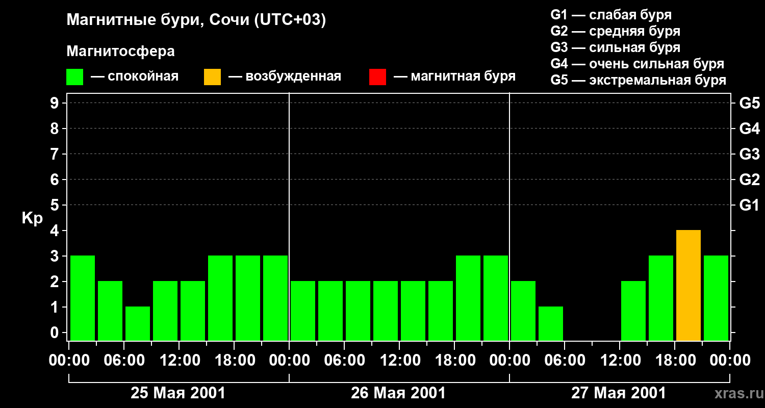 Изменения геомагнитного индекса Kp с 25 по 27 мая 2001 года для средних широт