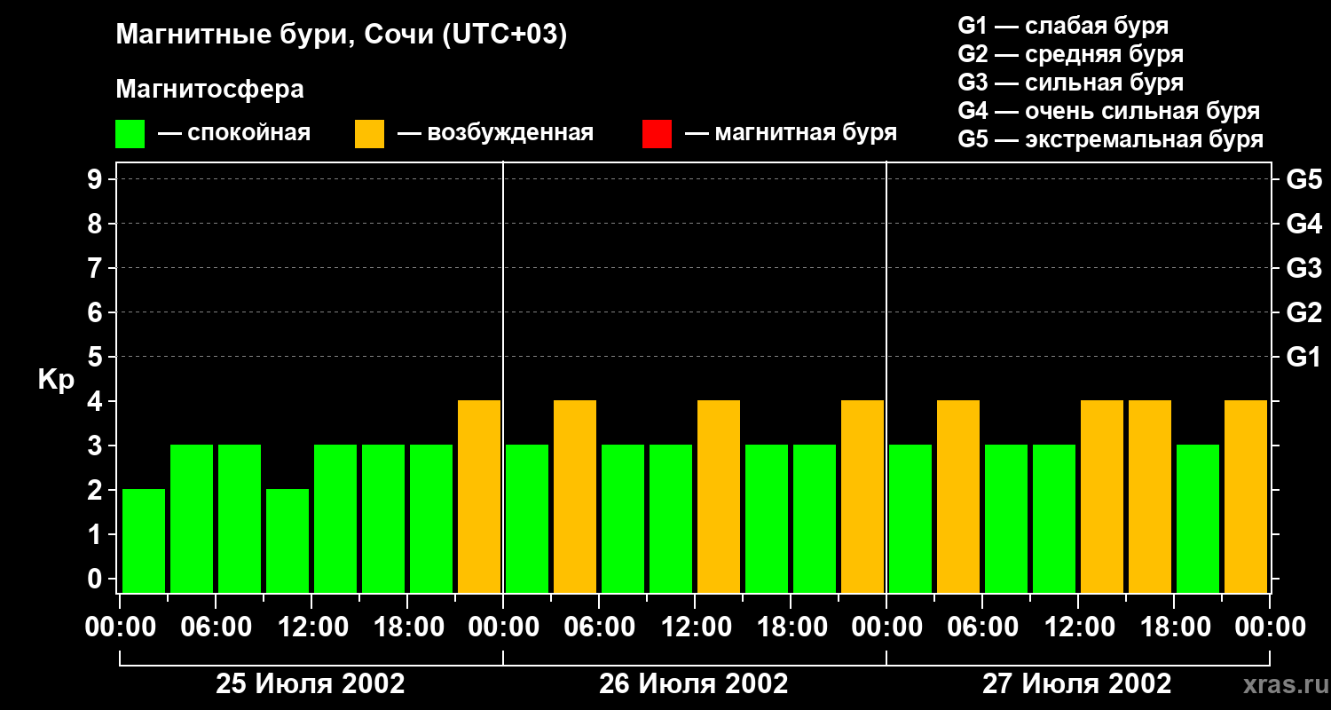 Изменения геомагнитного индекса Kp с 25 по 27 июля 2002 года для средних широт