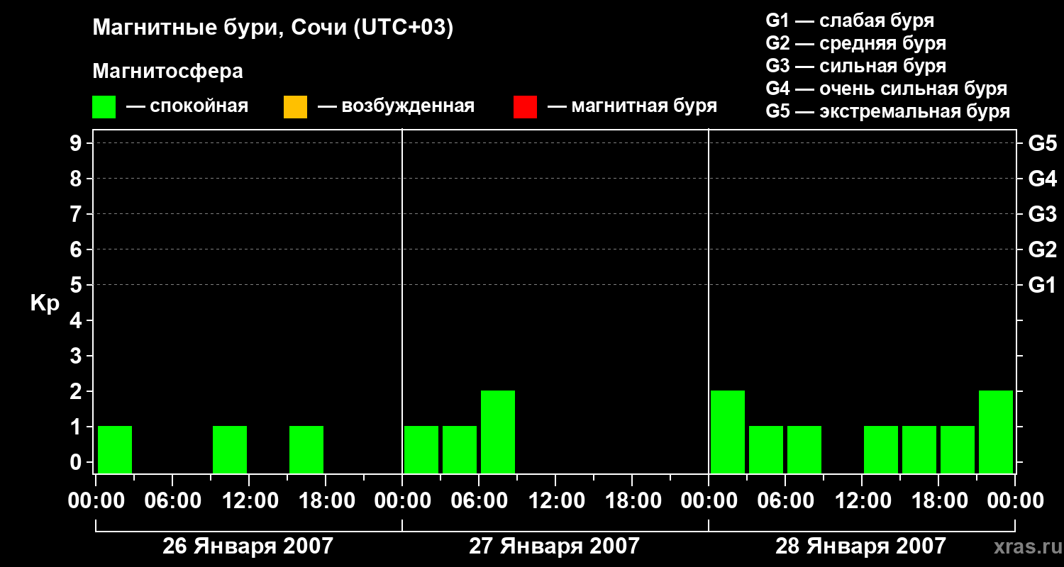 Изменения геомагнитного индекса Kp с 26 по 28 января 2007 года для средних широт