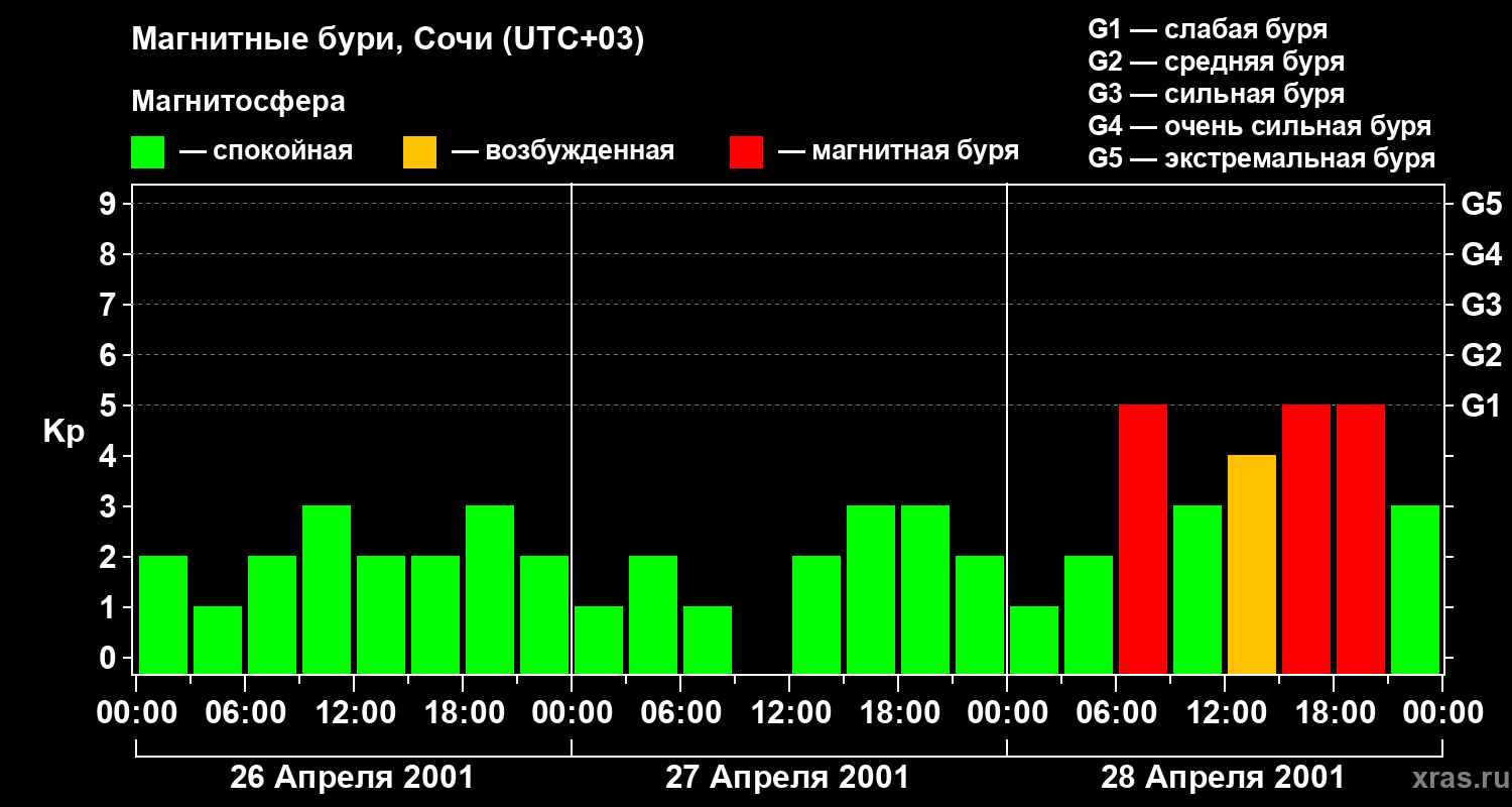 Изменения геомагнитного индекса Kp с 26 по 28 апреля 2001 года для средних широт