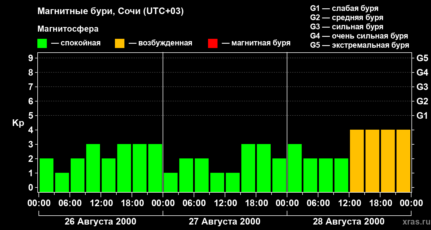 Изменения геомагнитного индекса Kp с 26 по 28 августа 2000 года для средних широт