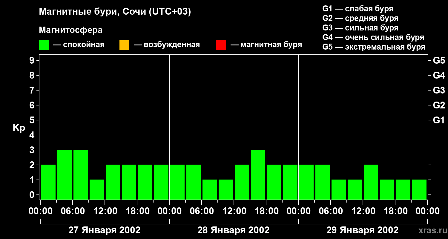 Изменения геомагнитного индекса Kp с 27 по 29 января 2002 года для средних широт
