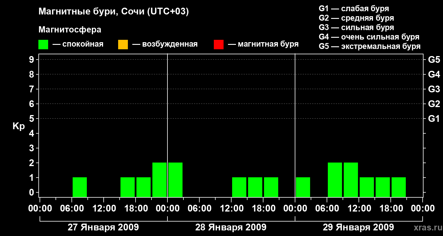 Изменения геомагнитного индекса Kp с 27 по 29 января 2009 года для средних широт