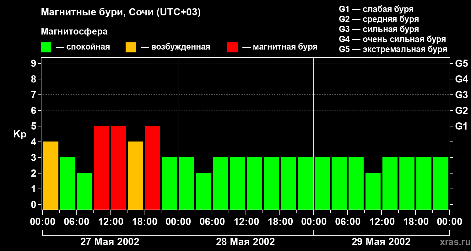 Изменения геомагнитного индекса Kp с 27 по 29 мая 2002 года для средних широт