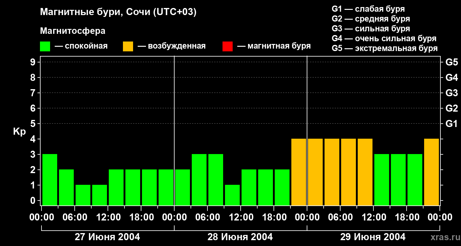 Изменения геомагнитного индекса Kp с 27 по 29 июня 2004 года для средних широт