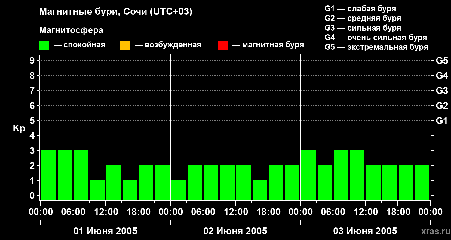 Изменения геомагнитного индекса Kp с 1 по 3 июня 2005 года для средних широт
