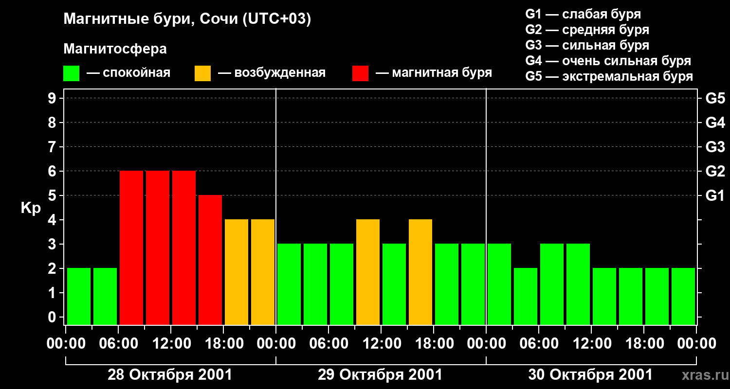 Изменения геомагнитного индекса Kp с 28 по 30 октября 2001 года для средних широт
