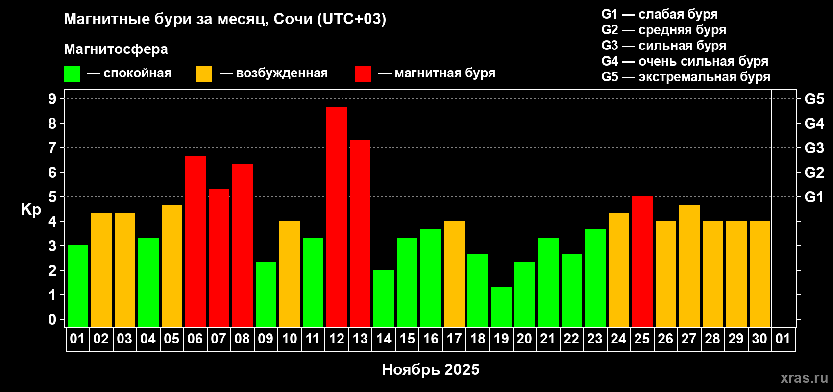 Изменения максимального суточного геомагнитного индекса Kp в ноябре 2025 года для средних широт