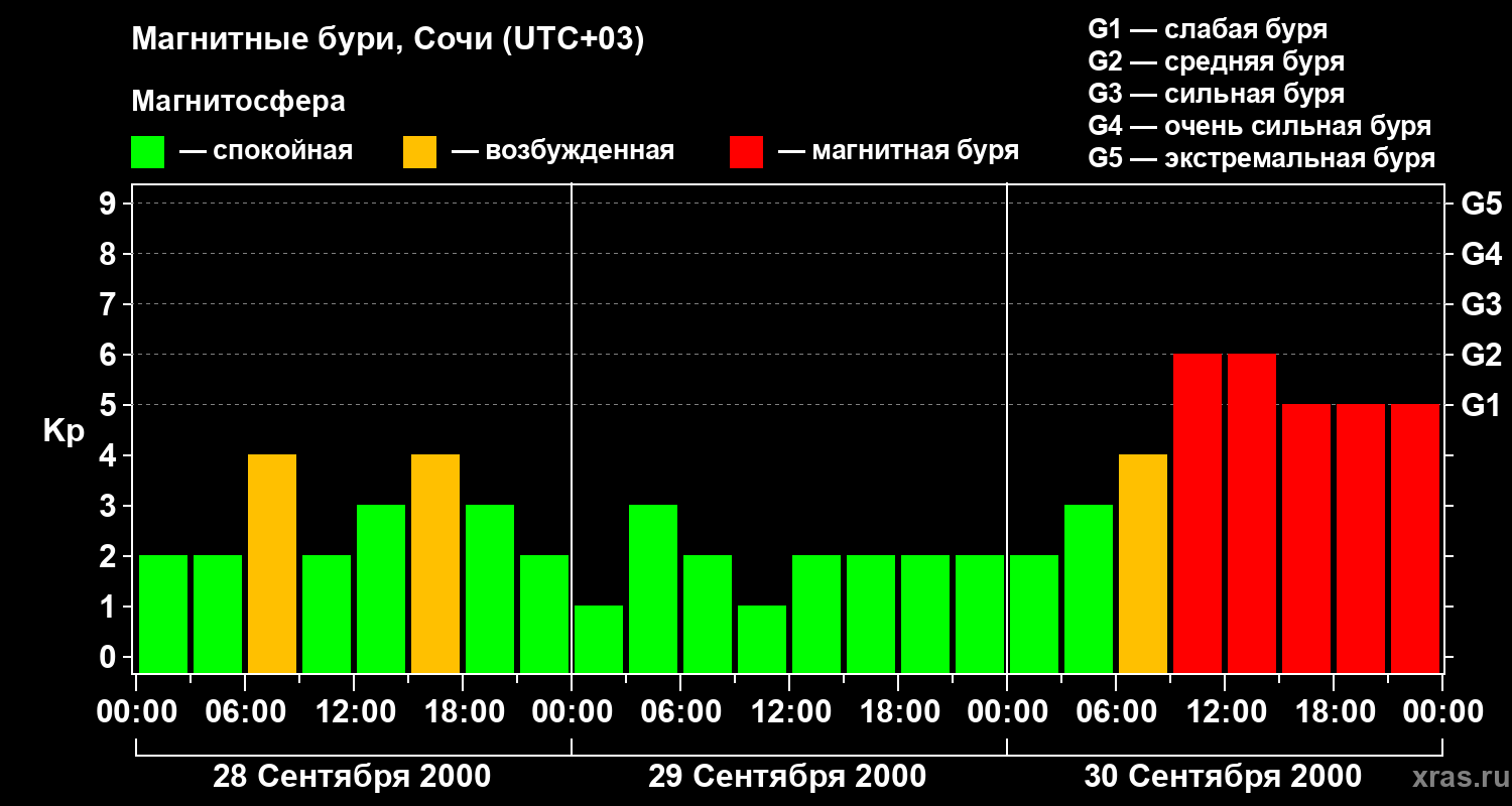 Изменения геомагнитного индекса Kp с 28 по 30 сентября 2000 года для средних широт
