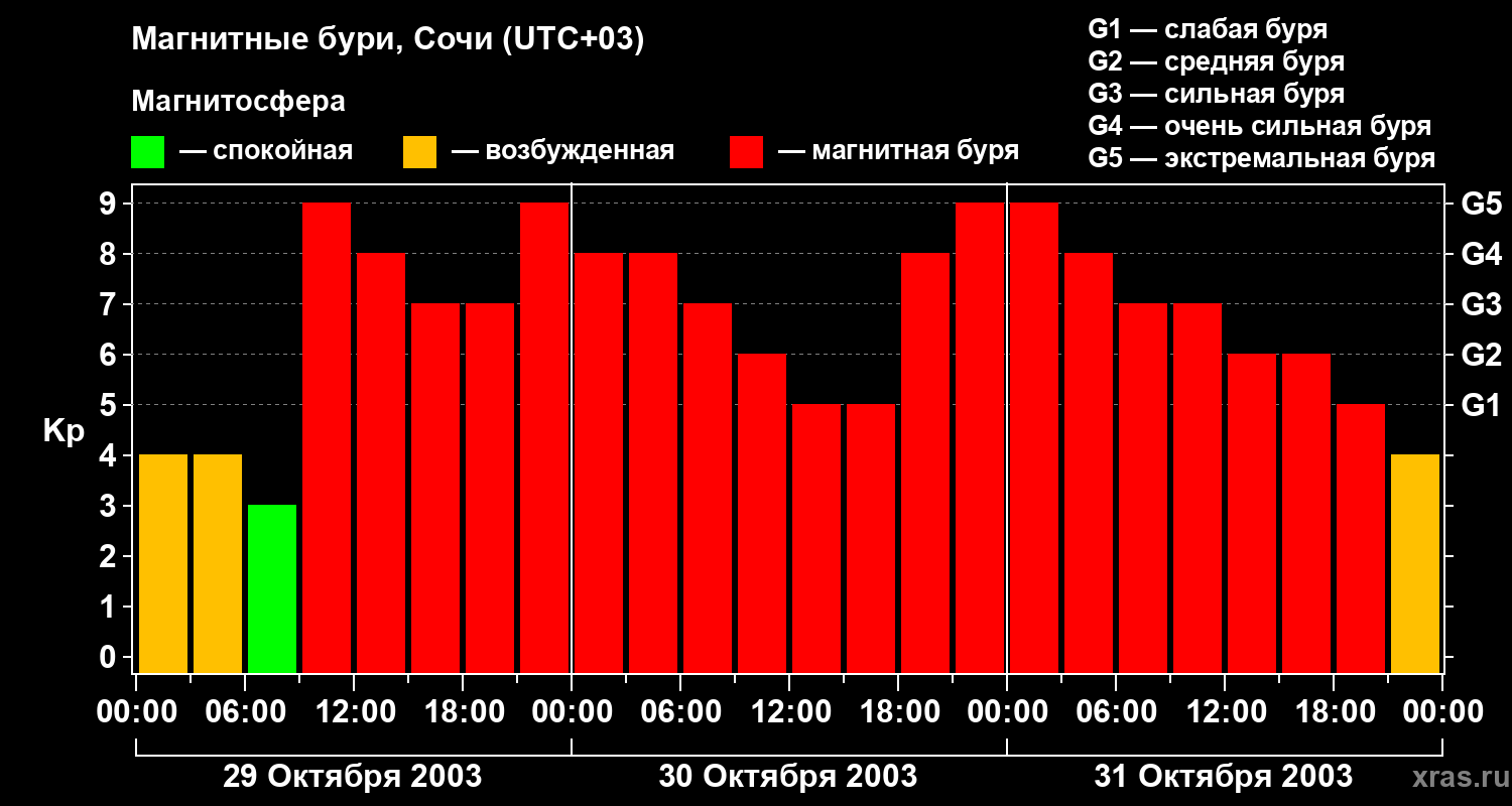 Изменения геомагнитного индекса Kp с 29 по 31 октября 2003 года для средних широт