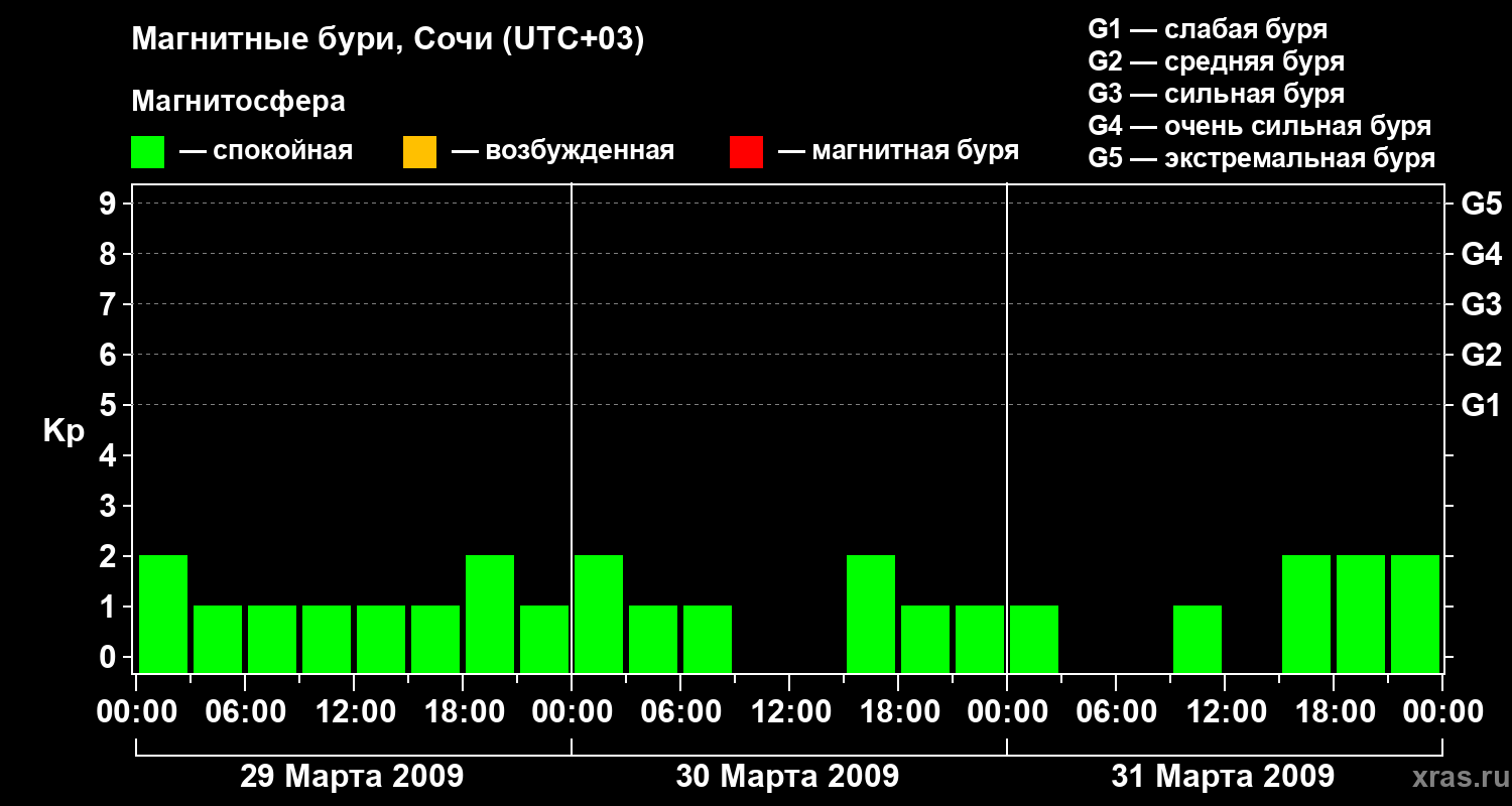 Изменения геомагнитного индекса Kp с 29 по 31 марта 2009 года для средних широт