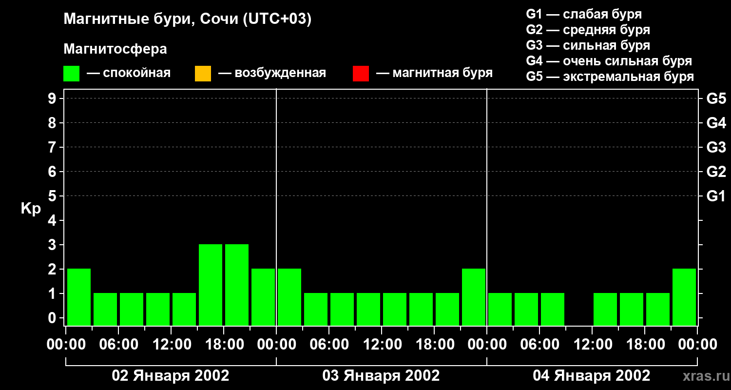 Изменения геомагнитного индекса Kp с 2 по 4 января 2002 года для средних широт