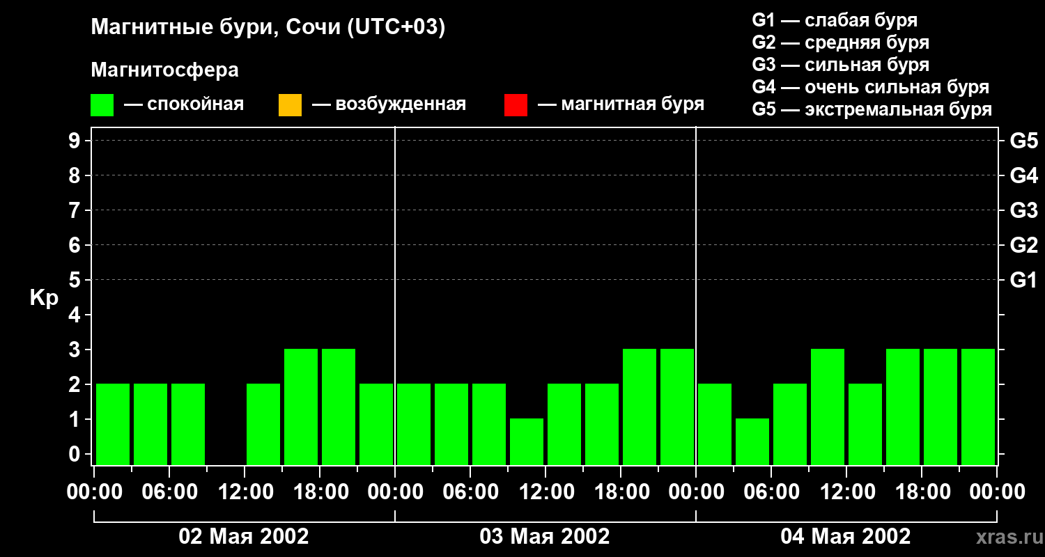 Изменения геомагнитного индекса Kp с 2 по 4 мая 2002 года для средних широт
