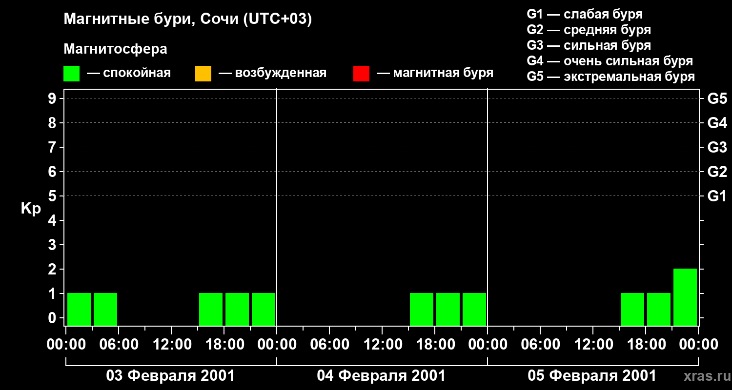 Изменения геомагнитного индекса Kp с 3 по 5 февраля 2001 года для средних широт