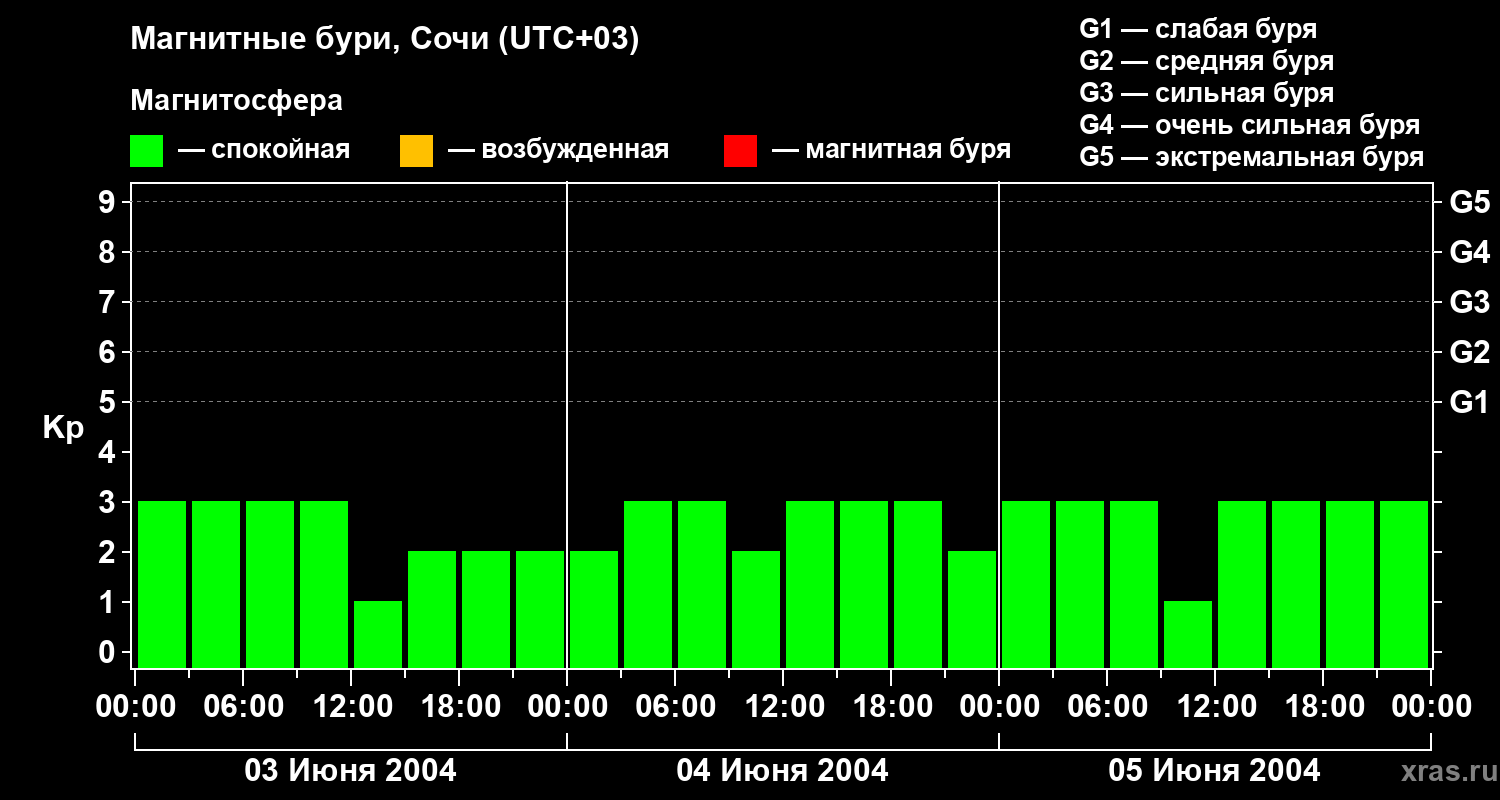 Изменения геомагнитного индекса Kp с 3 по 5 июня 2004 года для средних широт