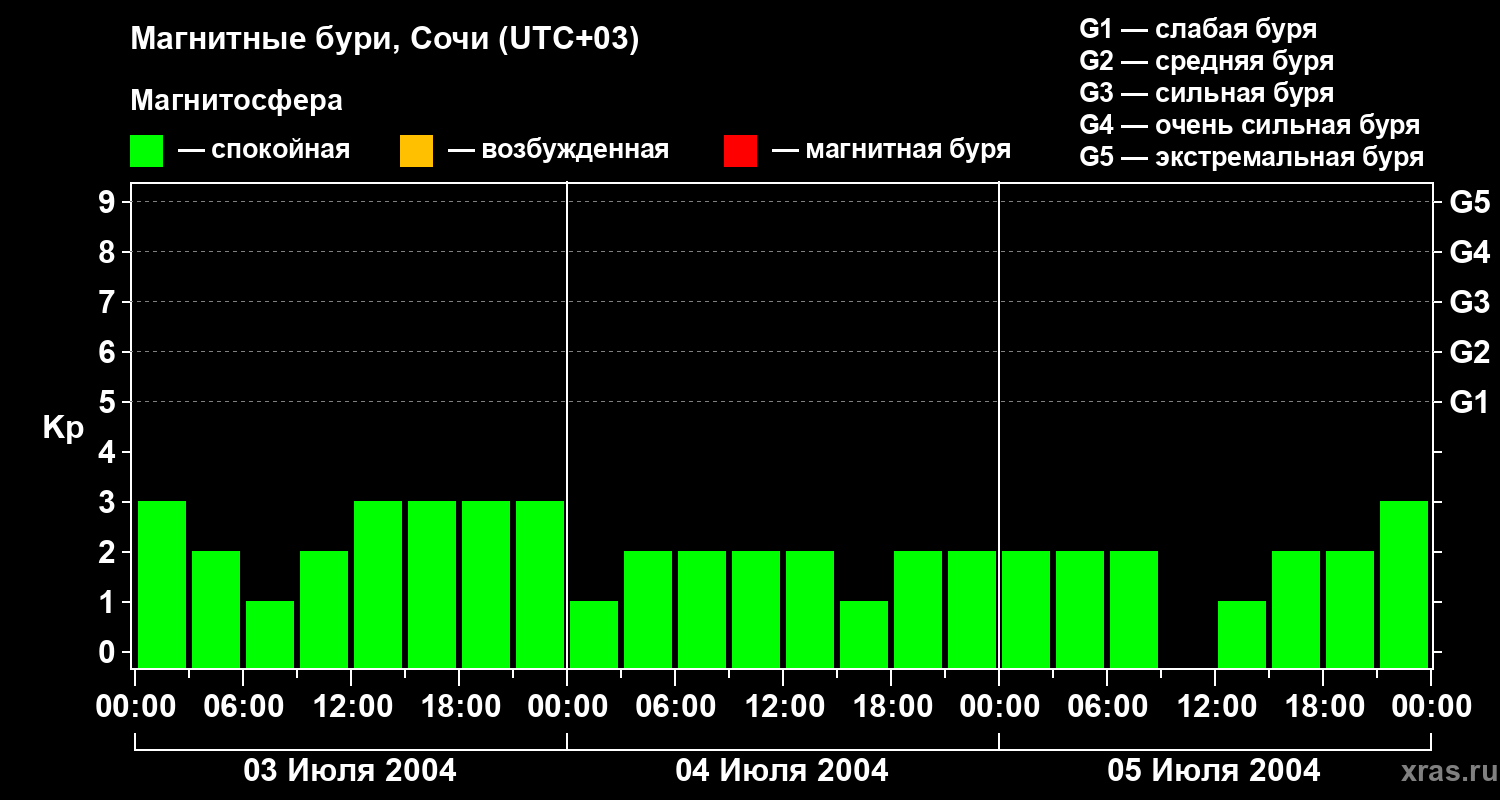 Изменения геомагнитного индекса Kp с 3 по 5 июля 2004 года для средних широт
