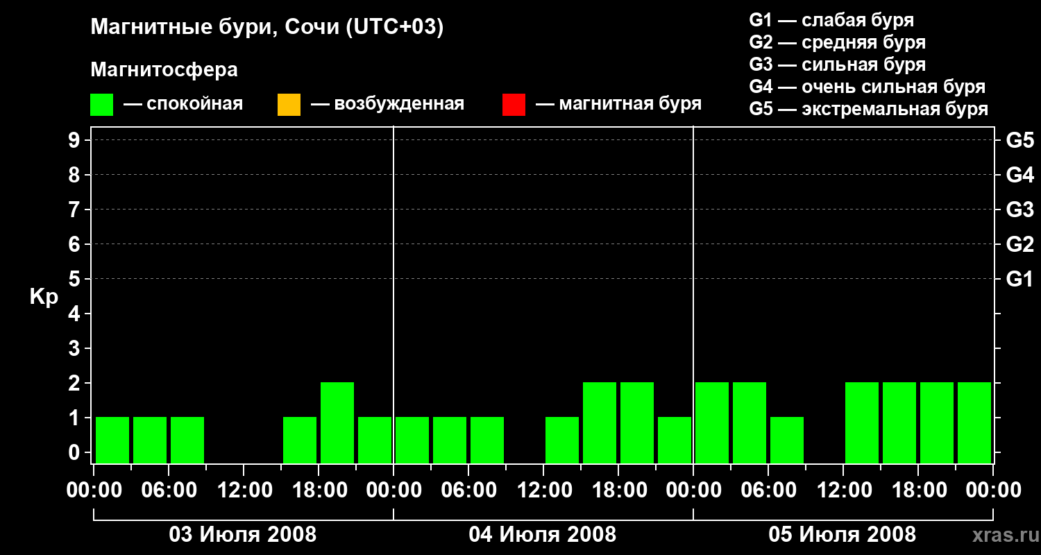 Изменения геомагнитного индекса Kp с 3 по 5 июля 2008 года для средних широт