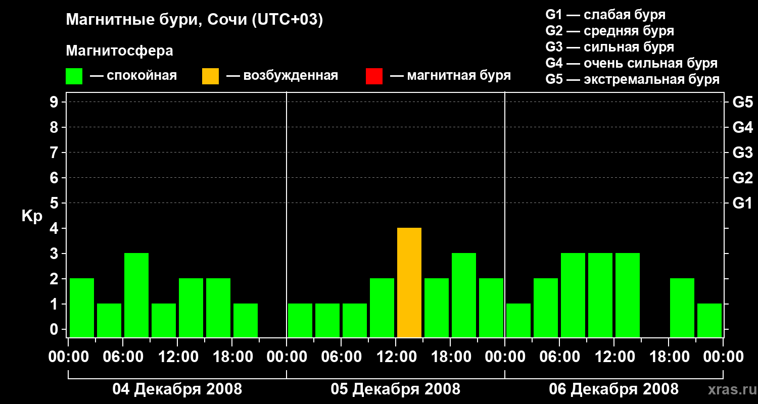 Изменения геомагнитного индекса Kp с 4 по 6 декабря 2008 года для средних широт