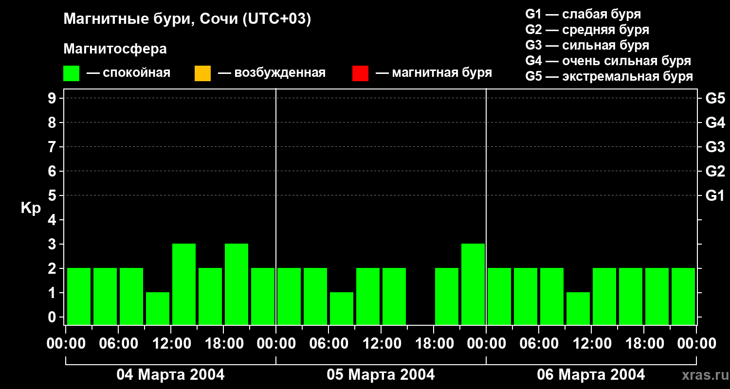 Изменения геомагнитного индекса Kp с 4 по 6 марта 2004 года для средних широт
