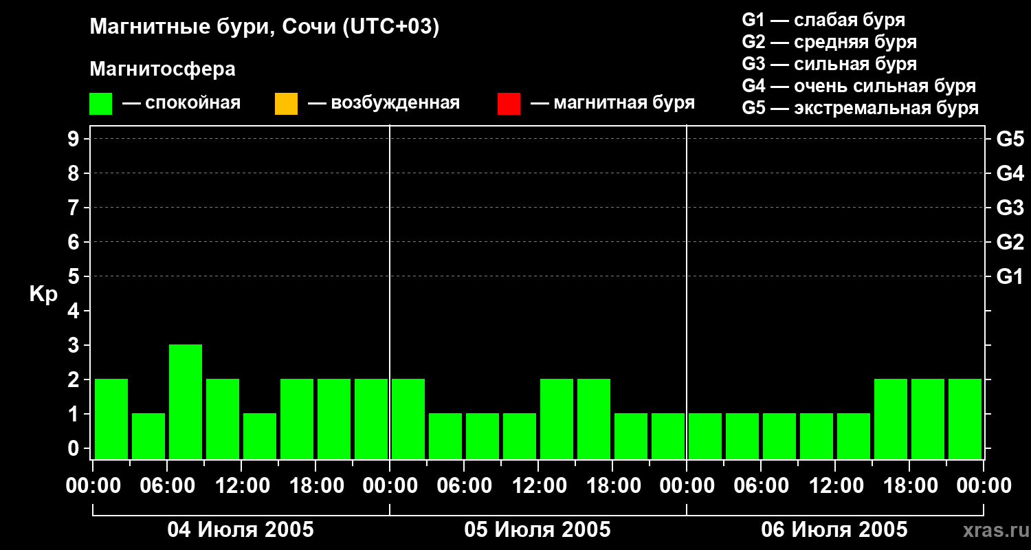 Изменения геомагнитного индекса Kp с 4 по 6 июля 2005 года для средних широт