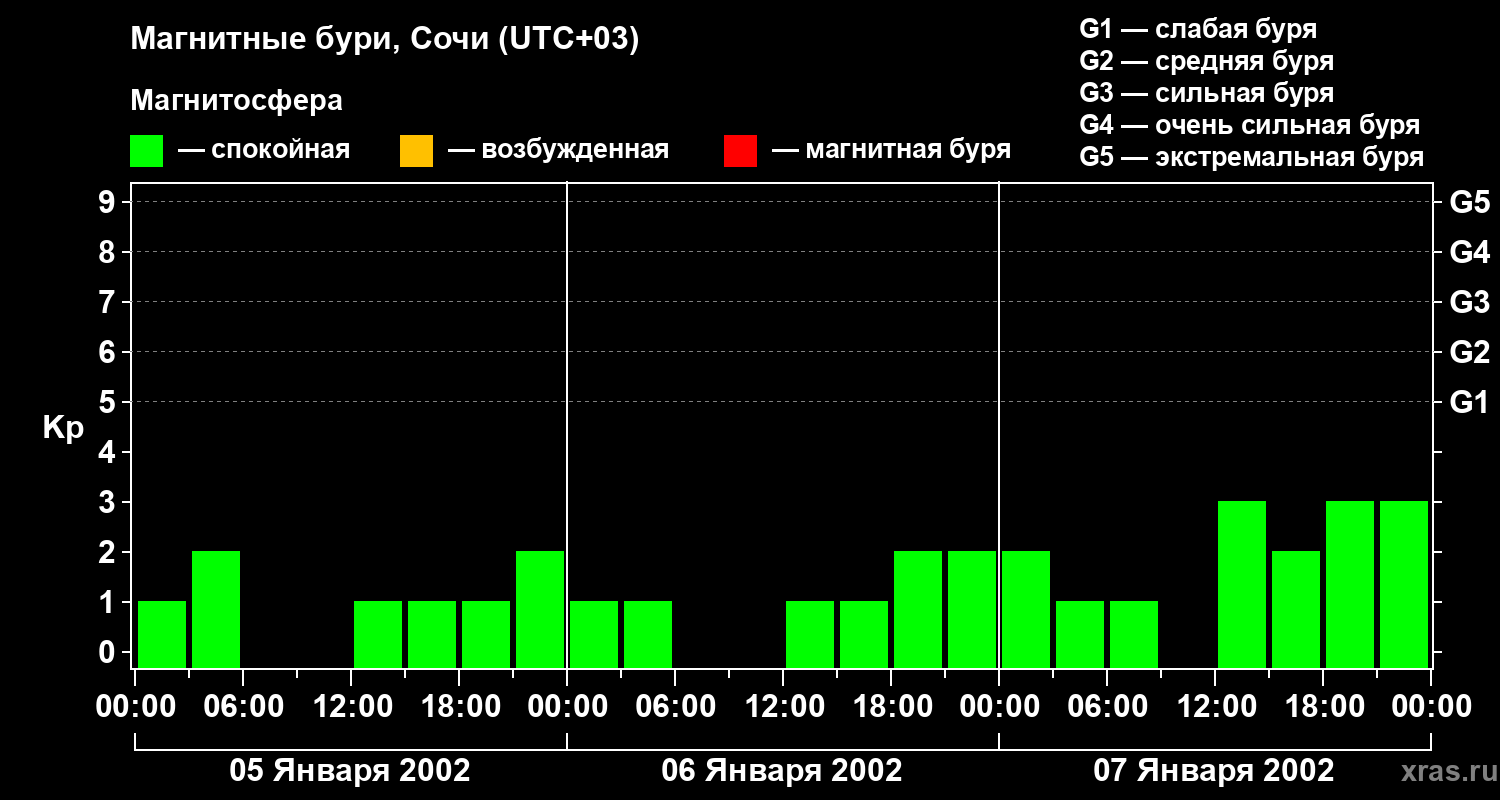 Изменения геомагнитного индекса Kp с 5 по 7 января 2002 года для средних широт