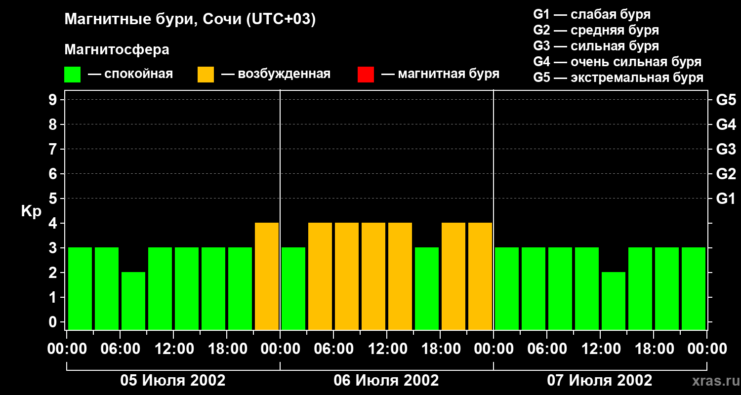 Изменения геомагнитного индекса Kp с 5 по 7 июля 2002 года для средних широт