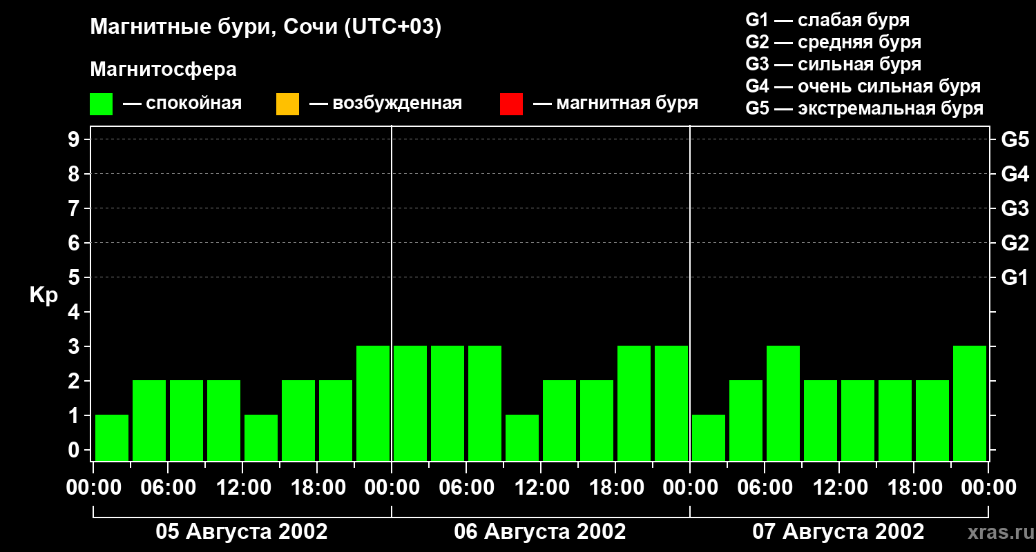 Изменения геомагнитного индекса Kp с 5 по 7 августа 2002 года для средних широт