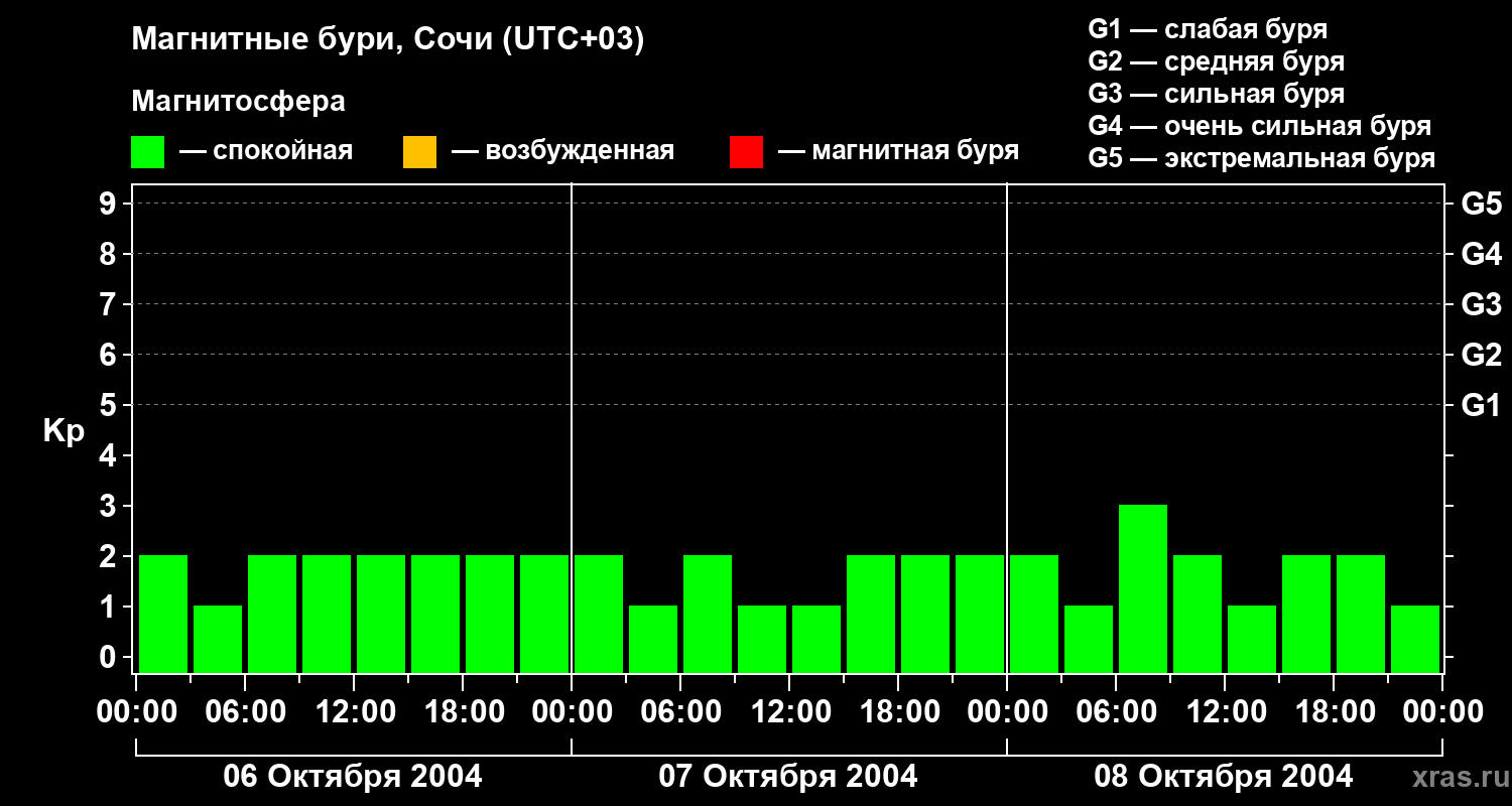 Изменения геомагнитного индекса Kp с 6 по 8 октября 2004 года для средних широт