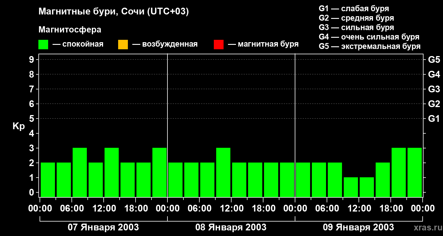Изменения геомагнитного индекса Kp с 7 по 9 января 2003 года для средних широт