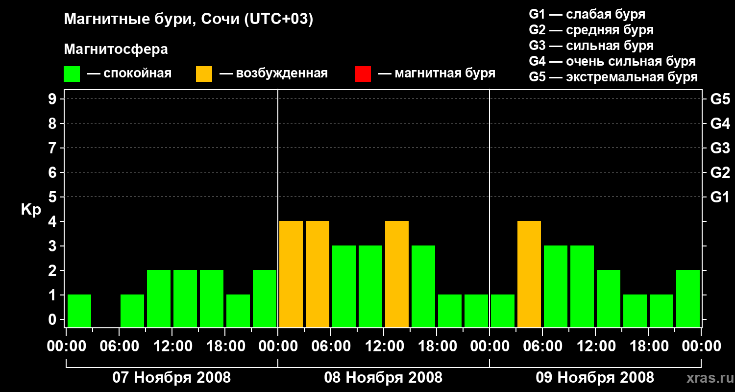 Изменения геомагнитного индекса Kp с 7 по 9 ноября 2008 года для средних широт