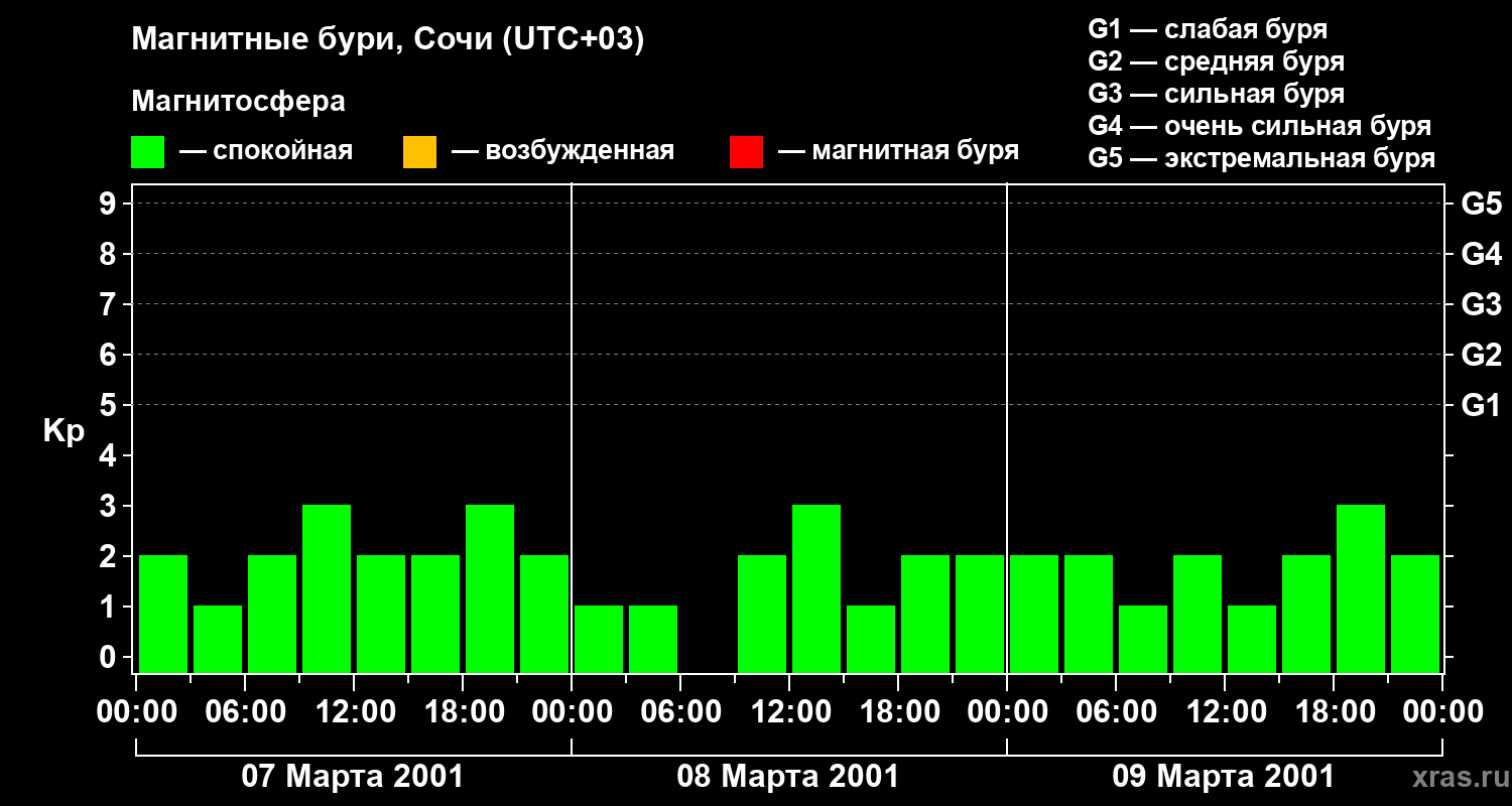 Изменения геомагнитного индекса Kp с 7 по 9 марта 2001 года для средних широт