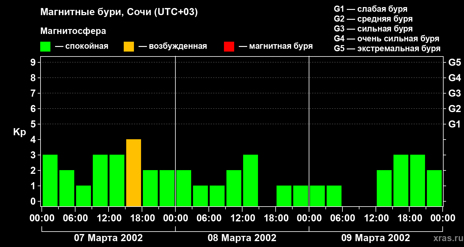 Изменения геомагнитного индекса Kp с 7 по 9 марта 2002 года для средних широт