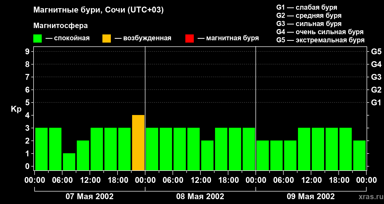 Изменения геомагнитного индекса Kp с 7 по 9 мая 2002 года для средних широт